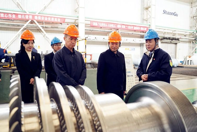 在总装车间,陈明检察长一行参观了大国重器总装配现场,详细听取了陕鼓在AV140轴流压缩机、10万超大型空分装备等研发制造方面的创新突破和市场应用情况。